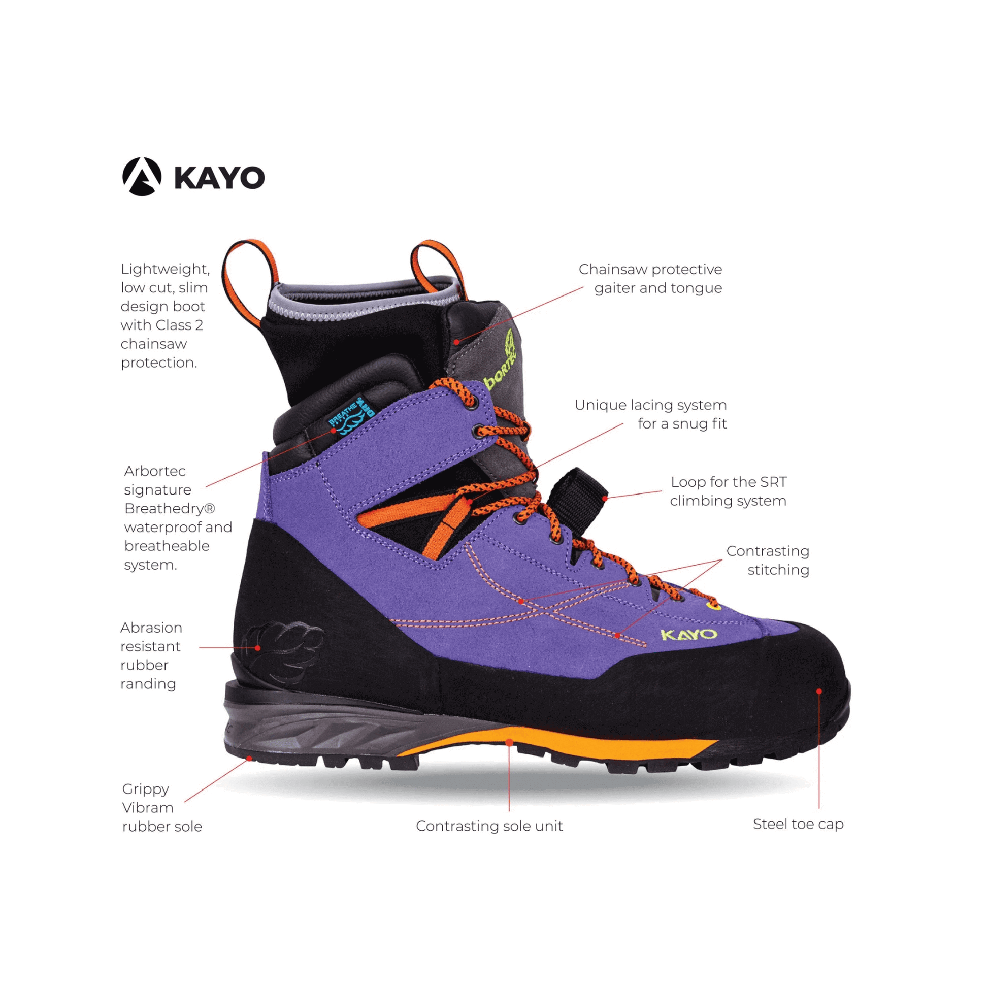 When you’re working all day in tree-surgery, arboriculture or rigging, your footwear must deliver more than just protection—it must deliver comfort, agility, grip and durability. The Arbortec Kayo boots combine one of the highest levels of cut-resistance in their class (Class 2), with a climbing-friendly low profile, lightweight build, premium materials and excellent all-weather waterproofing.