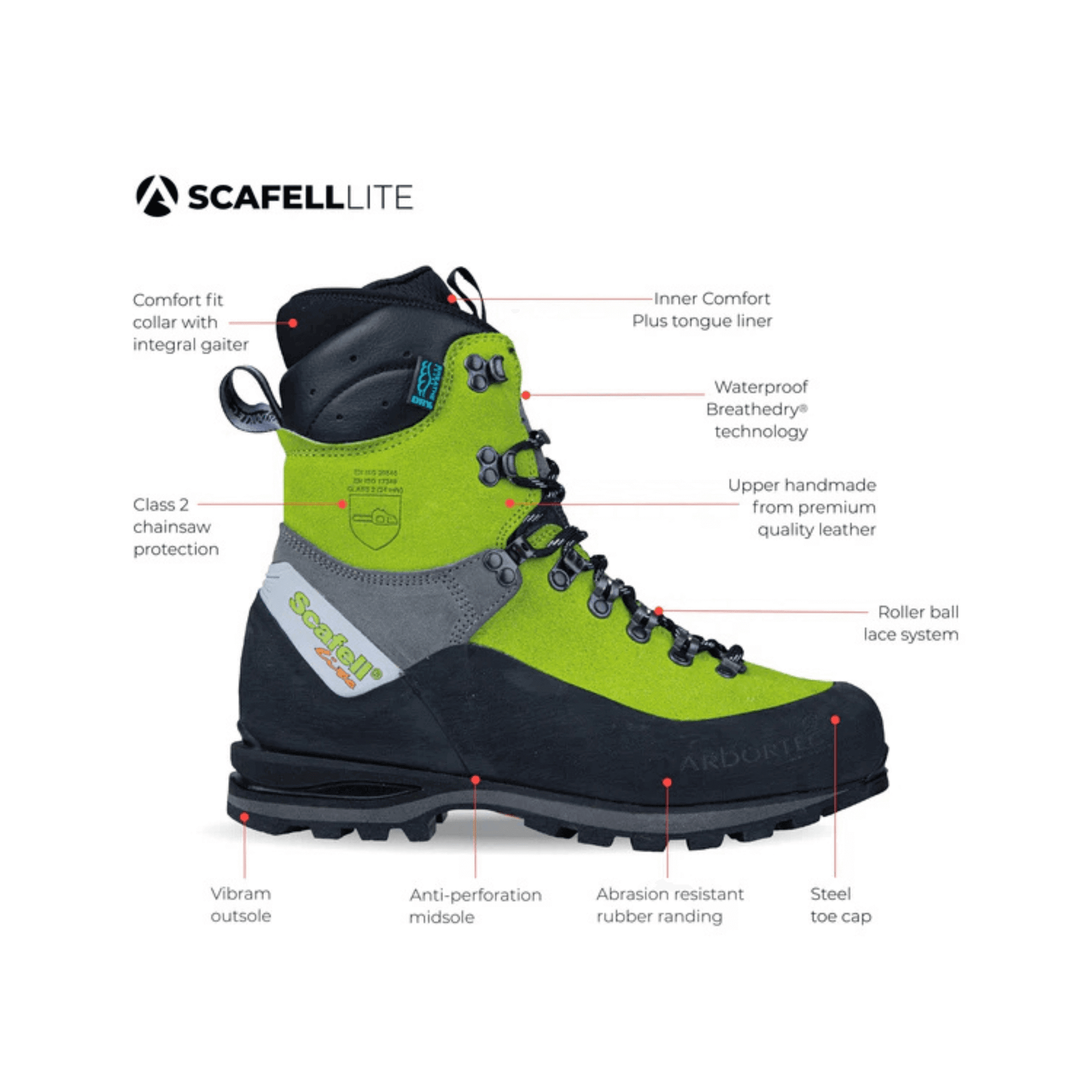 Designed for UK forestry, arboriculture and tree-surgery professionals who demand full chainsaw-protection footwear without sacrificing mobility and comfort. The Scafell Lite boots from Arbortec carry EN ISO 17249 Class 2 (24 m/s) chainsaw cut protection and feature a steel toecap, composite midsole for puncture resistance, premium leather upper, a 4-density sole unit with Vibram® outsole, and a waterproof BreatheDRY® membrane—all wrapped in a high-visibility lime finish.