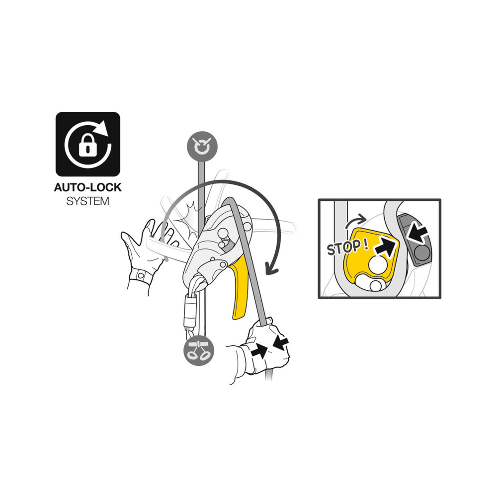 - Once locked, the rope can be taken up without having to manipulate the handle, allowing for easy short ascents, for example